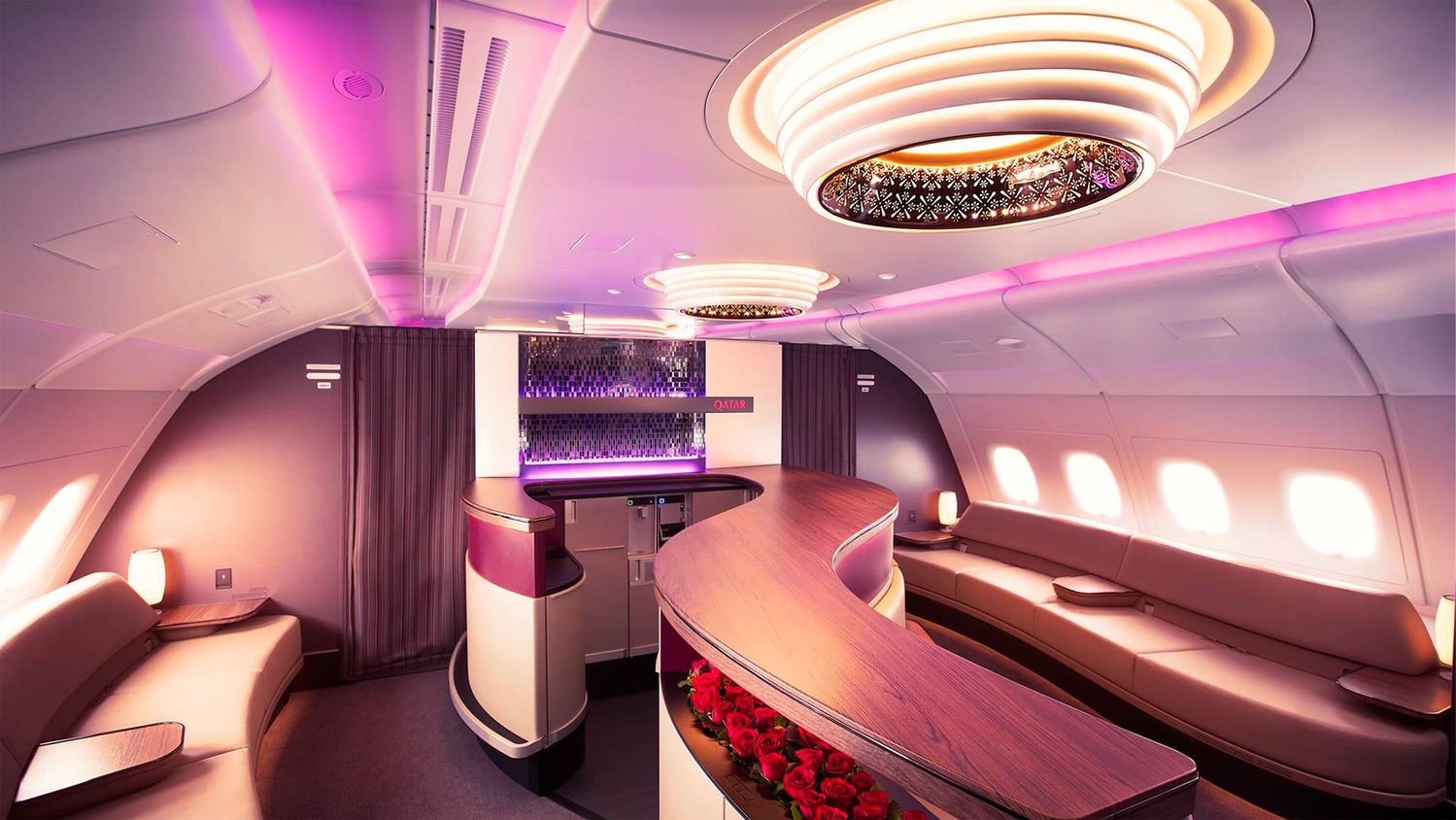 On board are eight beige and burgundy Qatar first suites in an open design which trades sliding door seclusion for the luxury of space and even allows you to dine with a plus one thanks to a comfy ottoman.