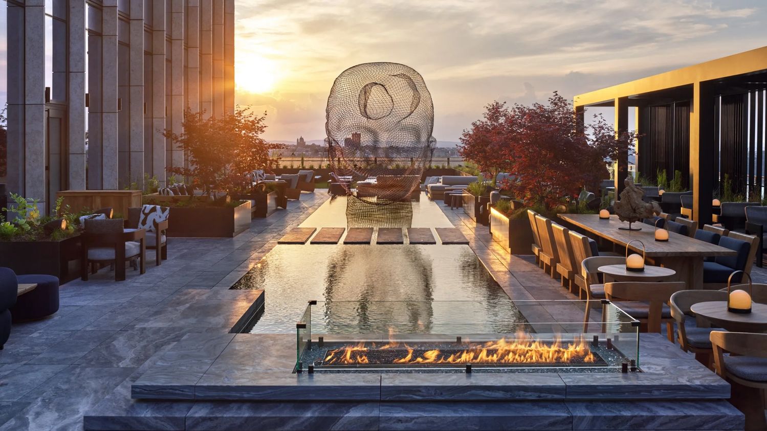 Up on the 14th floor and flanked by water features, fire pits and panoramic view of the city is the Garden Terrace – an alfresco dining destination serving light meals and drinks all day long. A retractable roof keeps it toasty warm in winter.