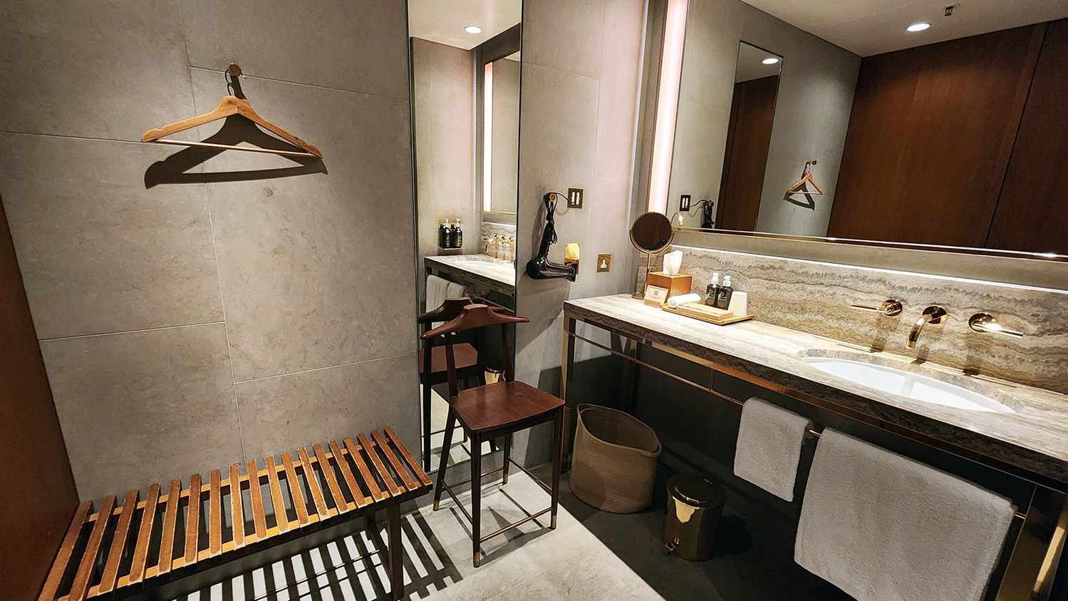 - those heavenly Aesop toiletries in the bathrooms and showers have been replaced by lotions and potions from British brand Bamford, which is also an inflight partner for Cathay first and business class