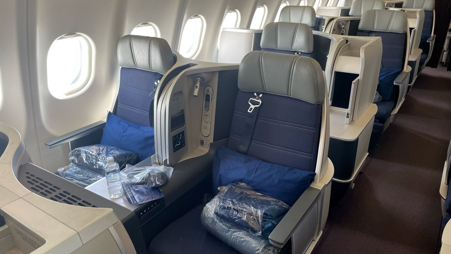 The middle seats are all paired, as usual, although lacking a divider which can be retracted to make it easier to chat with your seat-mate when flying with a partner.
