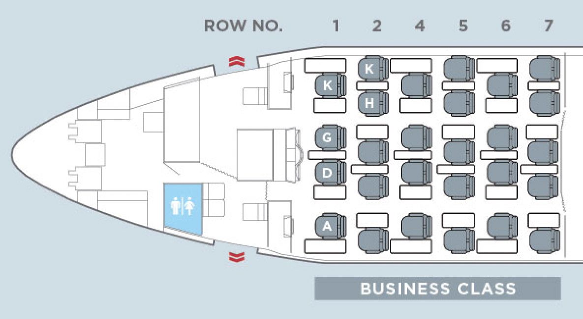 Seats on the right side of the business class cabin are a mix of doubles (at rows 2, 5 and 7), and singles (1K, 4K and 6K) which are flanked by two shelves.