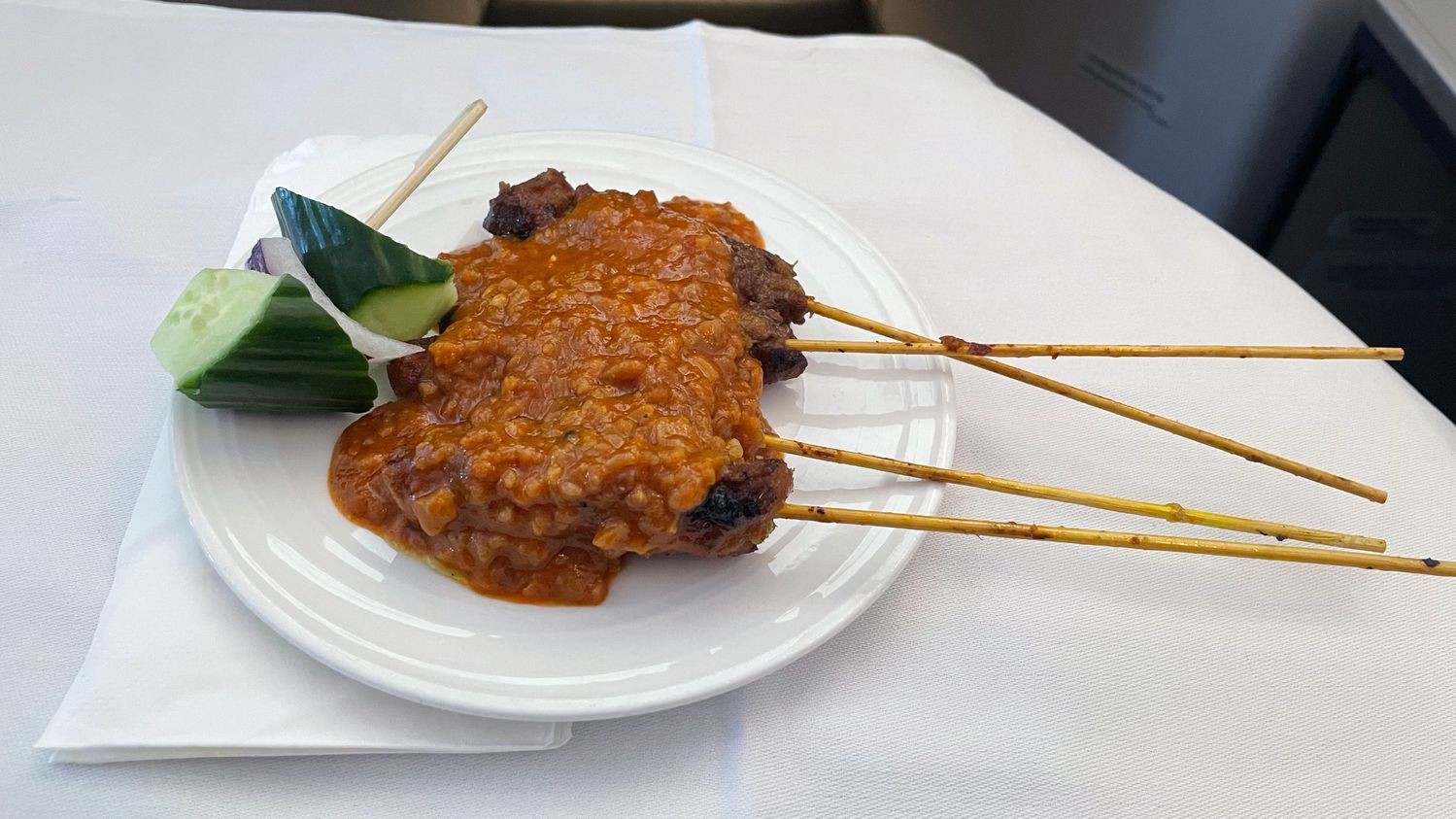 We flew KL to Sydney, daytime flight and were offered their superb satay skewers as starters before lunch, with lunch, during the flight and with pre-landing refreshments. Service with ‘many a smile’ and a hand written recipe for the satay sauce. Way to fly!