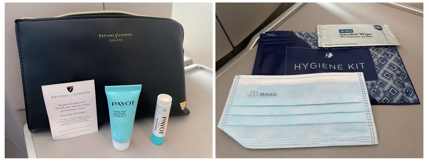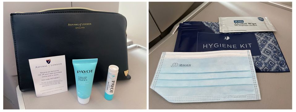 Business class passengers receive an Aspinal of London bag containing Payot Paris skincare products, and all passengers will find at their seat a hygiene kit with face mask and alcohol wipe.