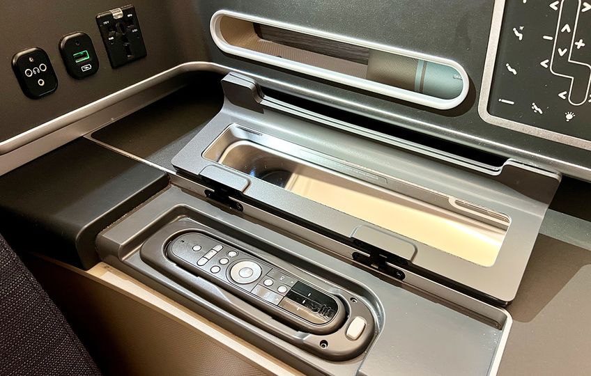 A pull-out tray beneath the monitor, a much wider footwell and a convenient storage nook alongside – large enough for a backpack or wheeled carry-on – are all exclusive perks of these two seats.