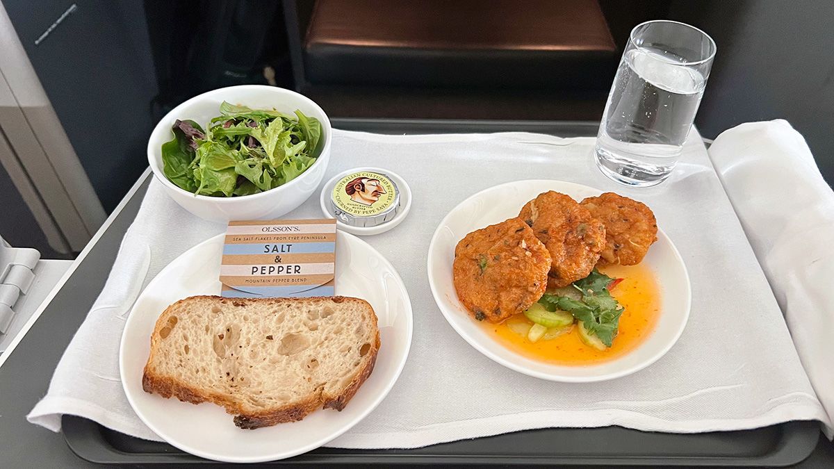 To begin the meal, passengers were offered a choice of zucchini and basil soup, Asian chicken salad with black sesame dressing, or Thai style fish cakes with pickled cucumber and chilli dressing. I opted for the latter.