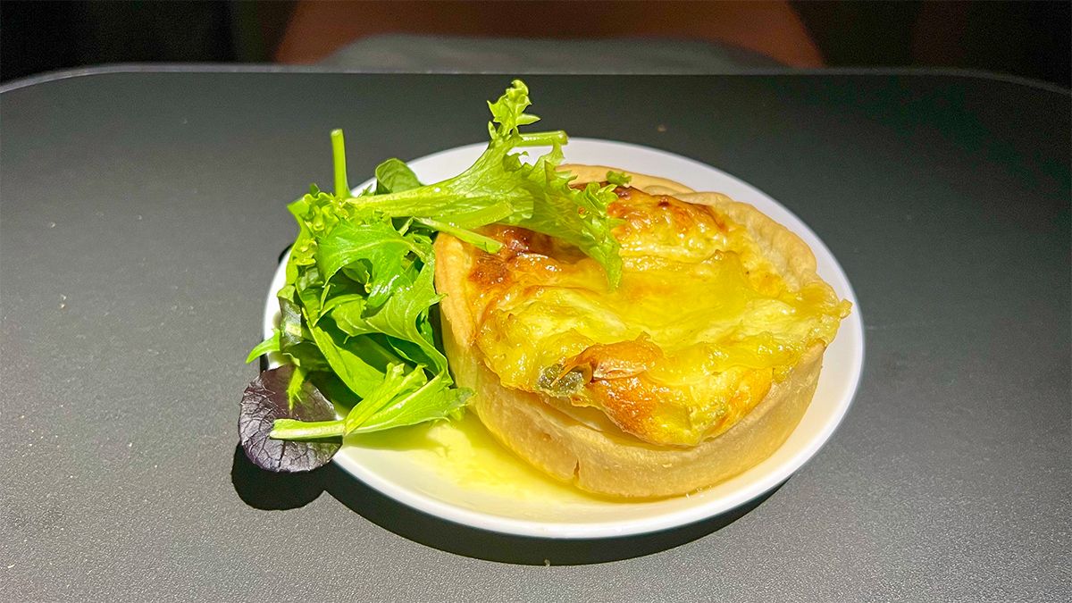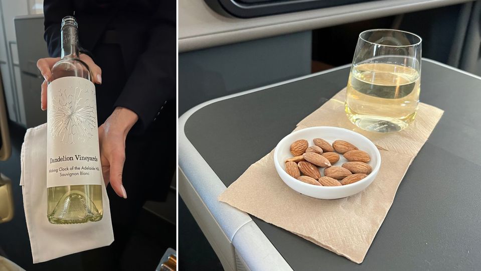 I kicked things off with a signature Qantas Sky Spritz – an aperitif of white wine spritz with finger lime and Davidson plum. When placing our order, the crew member noted it was “very sweet”.