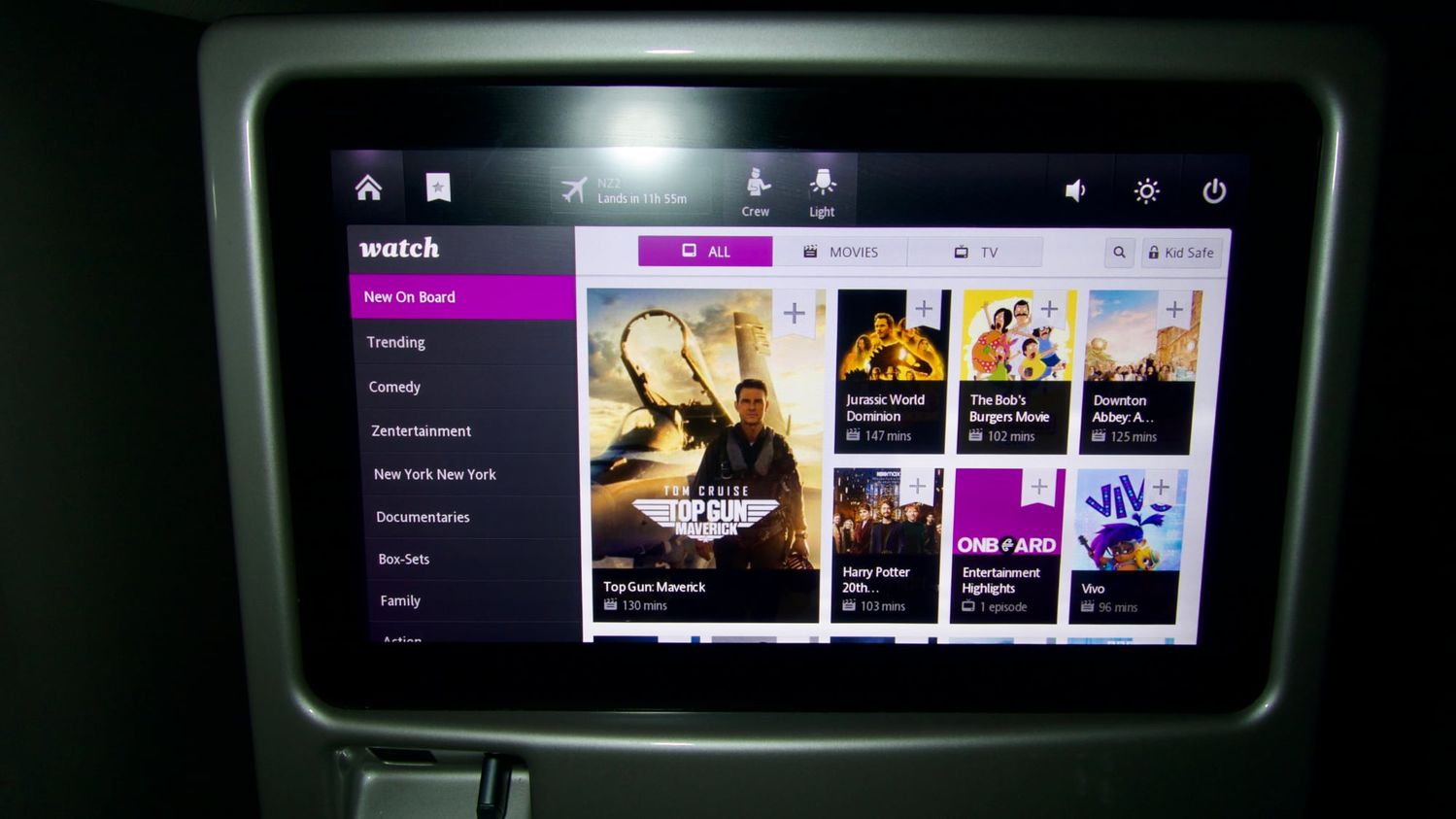 But while Air New Zealand’s well-stocked library offers plenty of choice – including Top Gun 2 – the 11-inch video screen which flips out from the side of the business class seat is smaller than any passengers’ laptop and even some iPads.