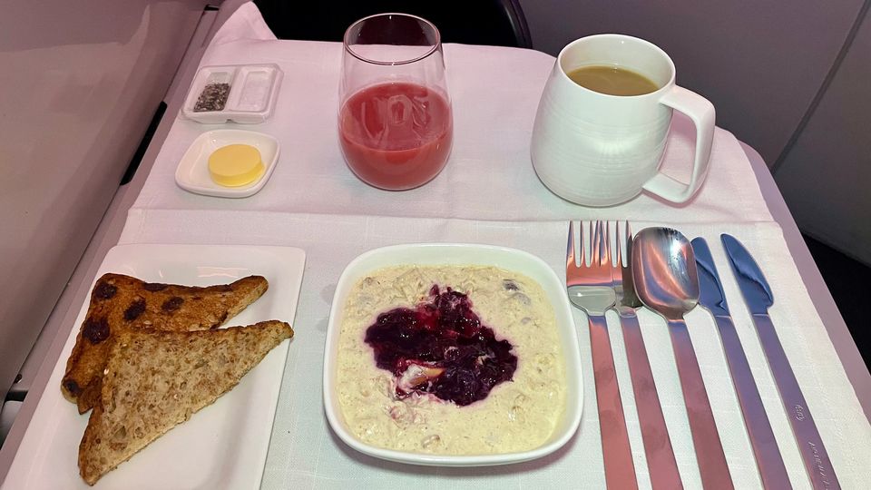 The LED lighting in the cabin begins slowing cycling through a sunrise pattern to help us wake up, ahead of what the menu oddly describes as ‘brunch’ although the selection is more like breakfast.