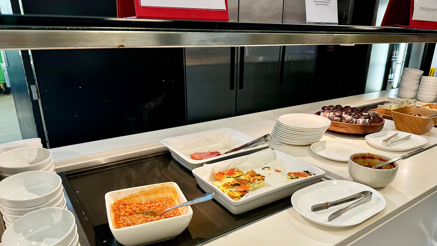 Our early morning visit saw the breakfast menu in full swing. This spanned hot dishes such as frittata, scrambled eggs, bacon, baked beans and pancakes, plus an assortment of cereals and breads for toasting.