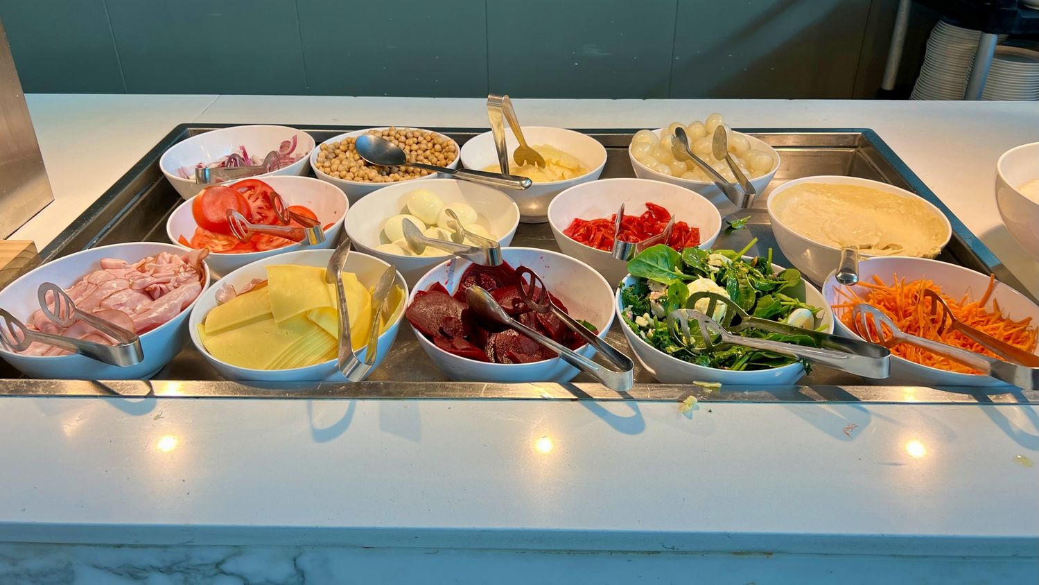Immediately inside is a lengthy buffet stocked with hot and cold options, an upright bench and lounge seating on your left, followed by yet more seating directly ahead.