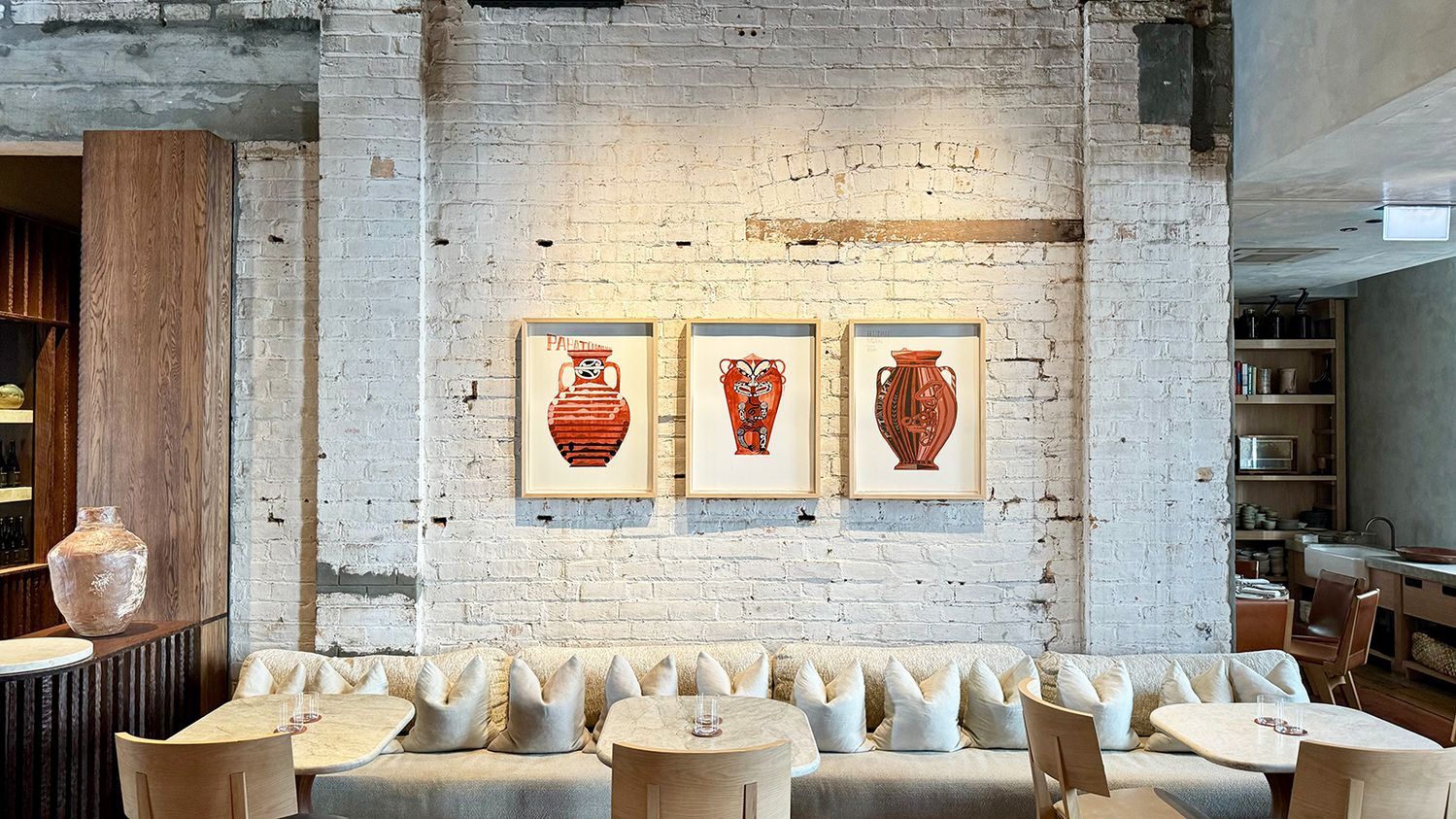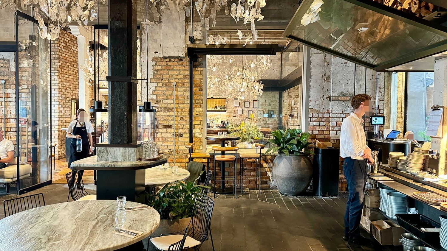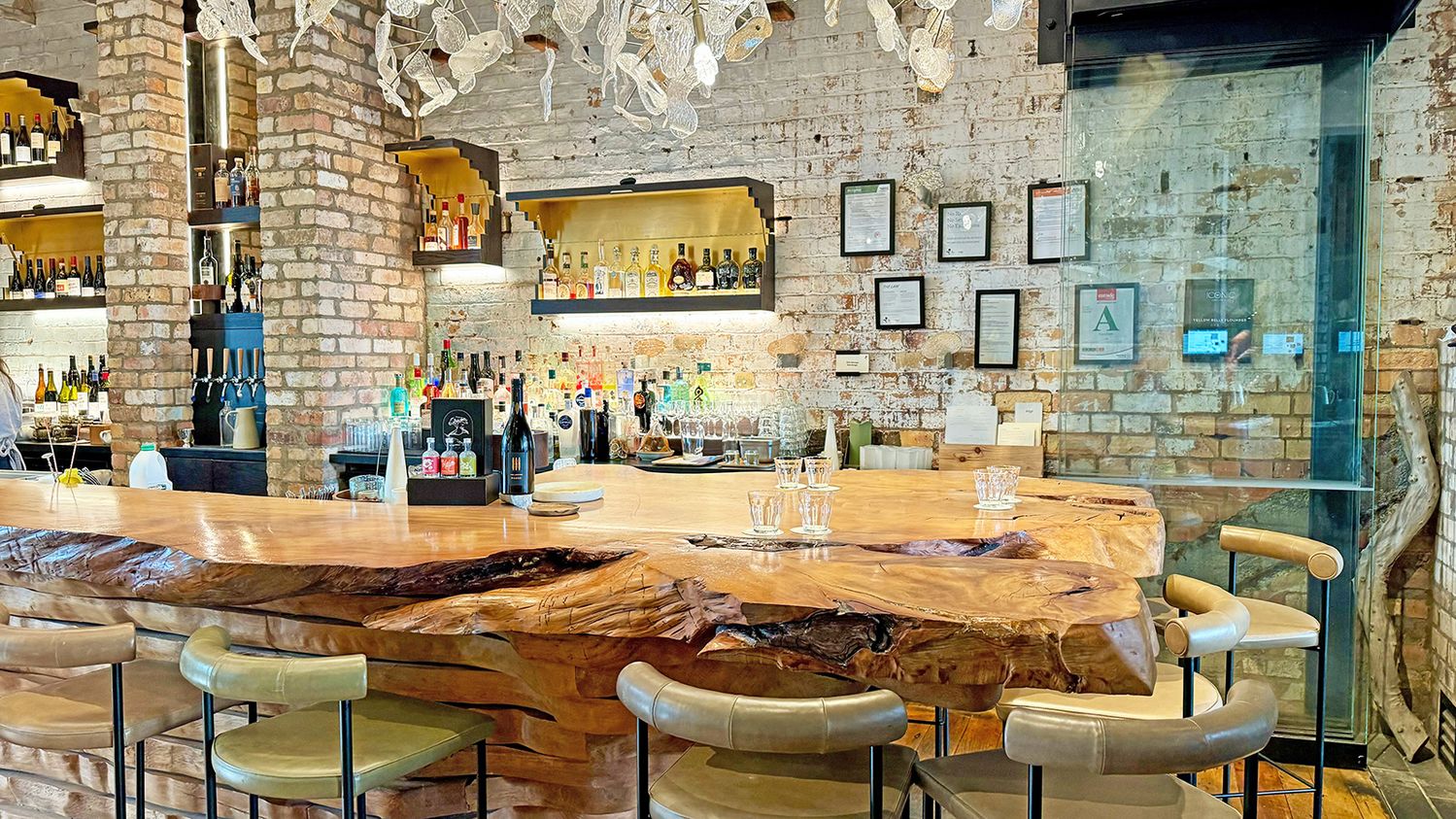 An L-shaped bar – beneath a glass sculpture said to resemble the scales of a fish – is the restaurant’s focal point, alongside an open kitchen and courtyard dining area.