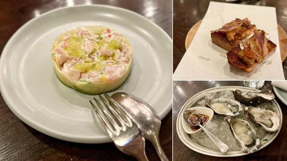Course one: Trevally kokoda topped in finger lime, Kina (sea urchin) on toast with pancetta, Te Matuku oysters.