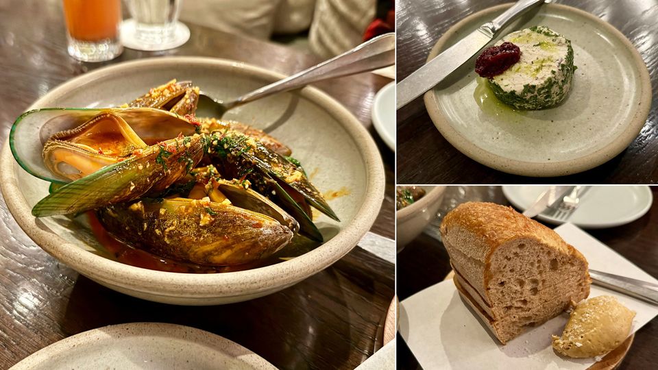 Course two: Green lipped mussels in Nudja, fromage blanc with raspberry and black olive tapenade, and kumara sourdough with burnt coconut butter.