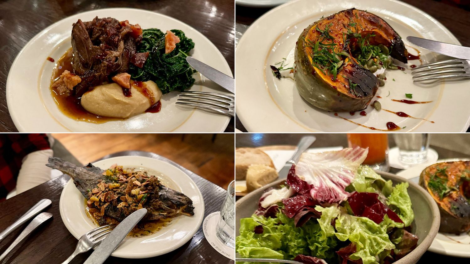 Course three: Wapiti venison shin with parsnip and quince, roast crown pumpkin with feijoa glaze, yellow belly flounder (my dish of the night), and a mixed leaf salad.